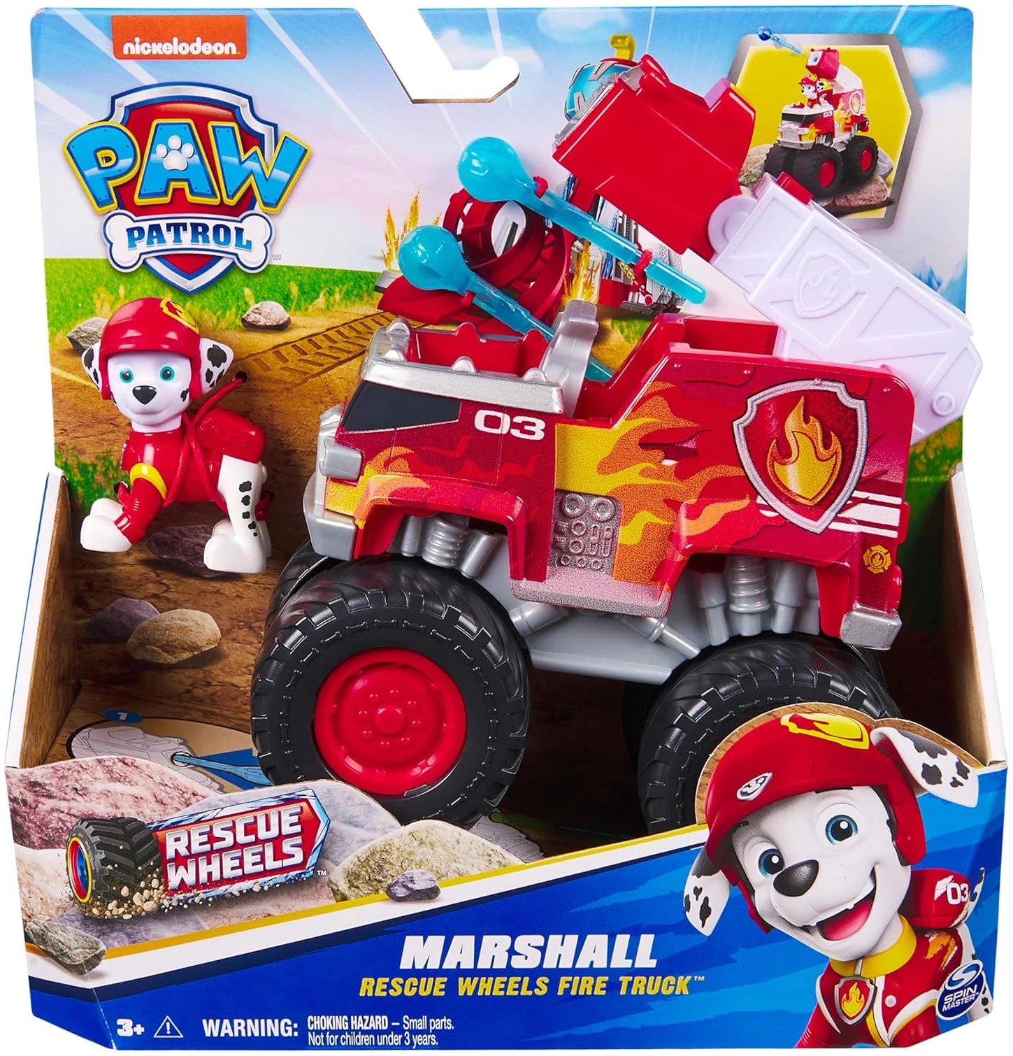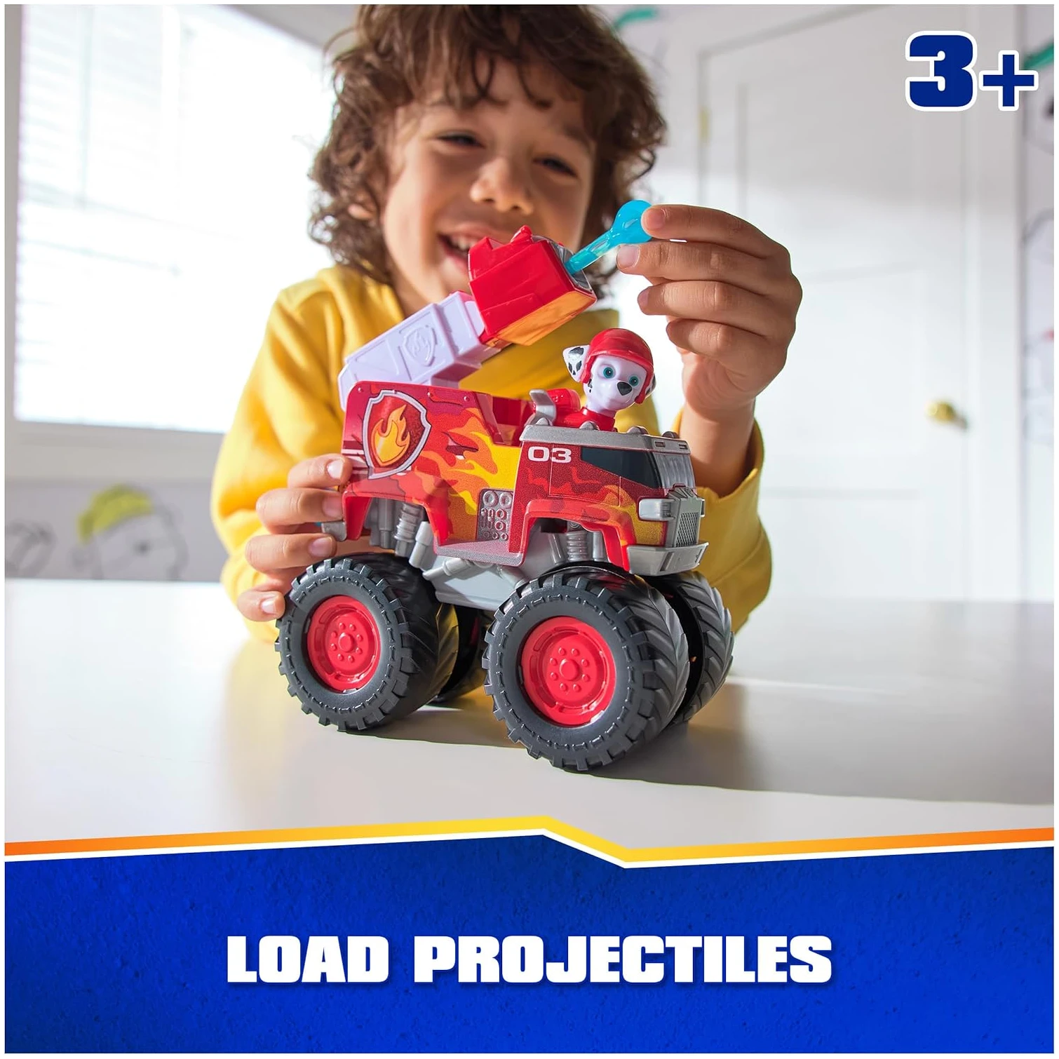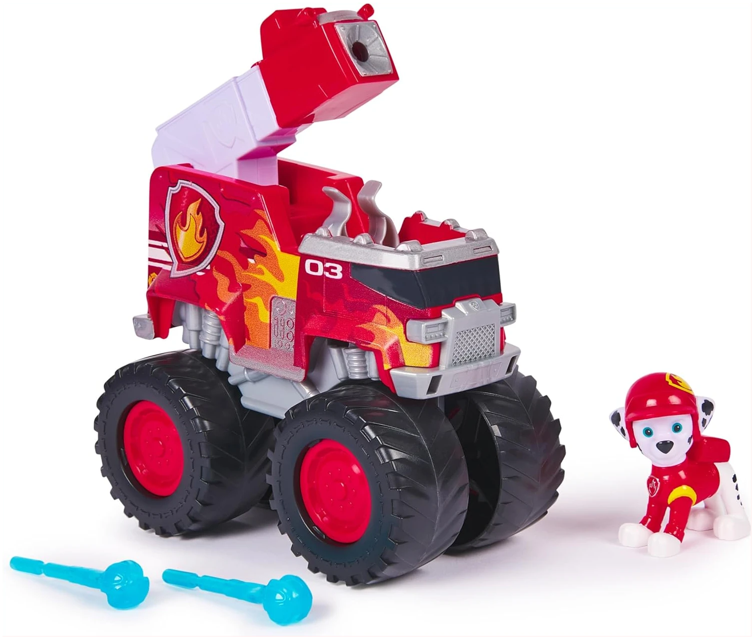 Ce jouet comprend une figurine amovible de Marcus avec son uniforme de mission tout-terrain, ainsi qu’un camion de pompiers équipé d’un lance-projectiles et de deux projectiles.