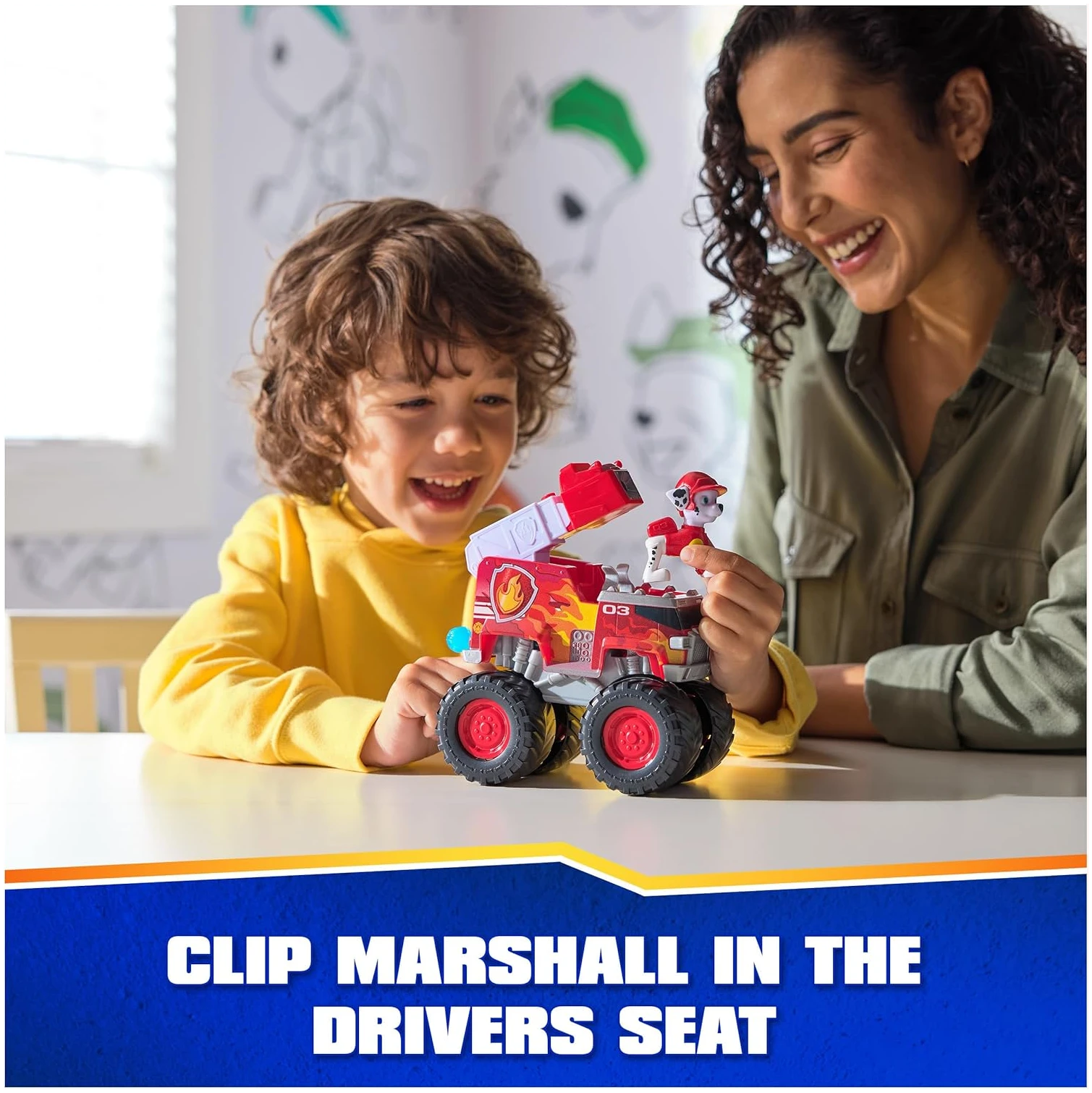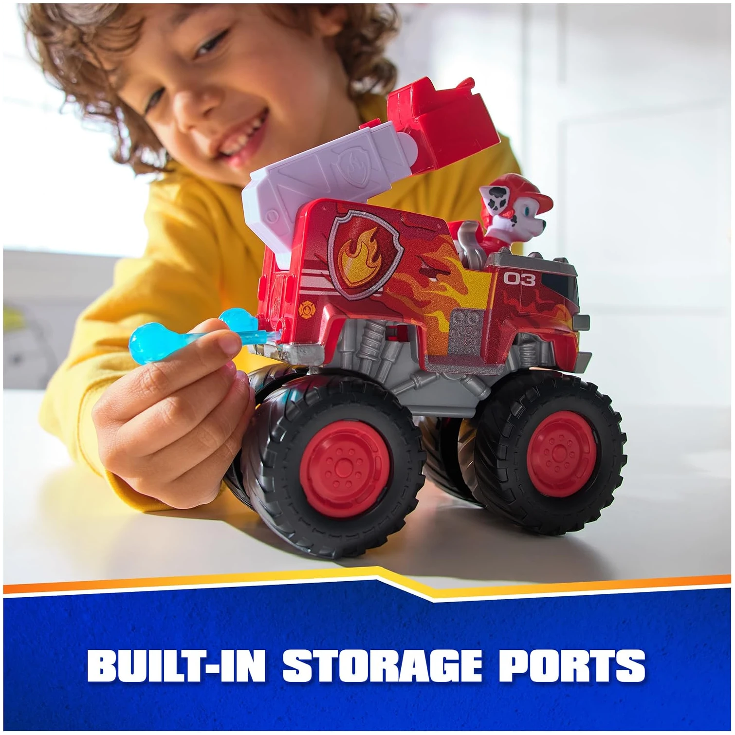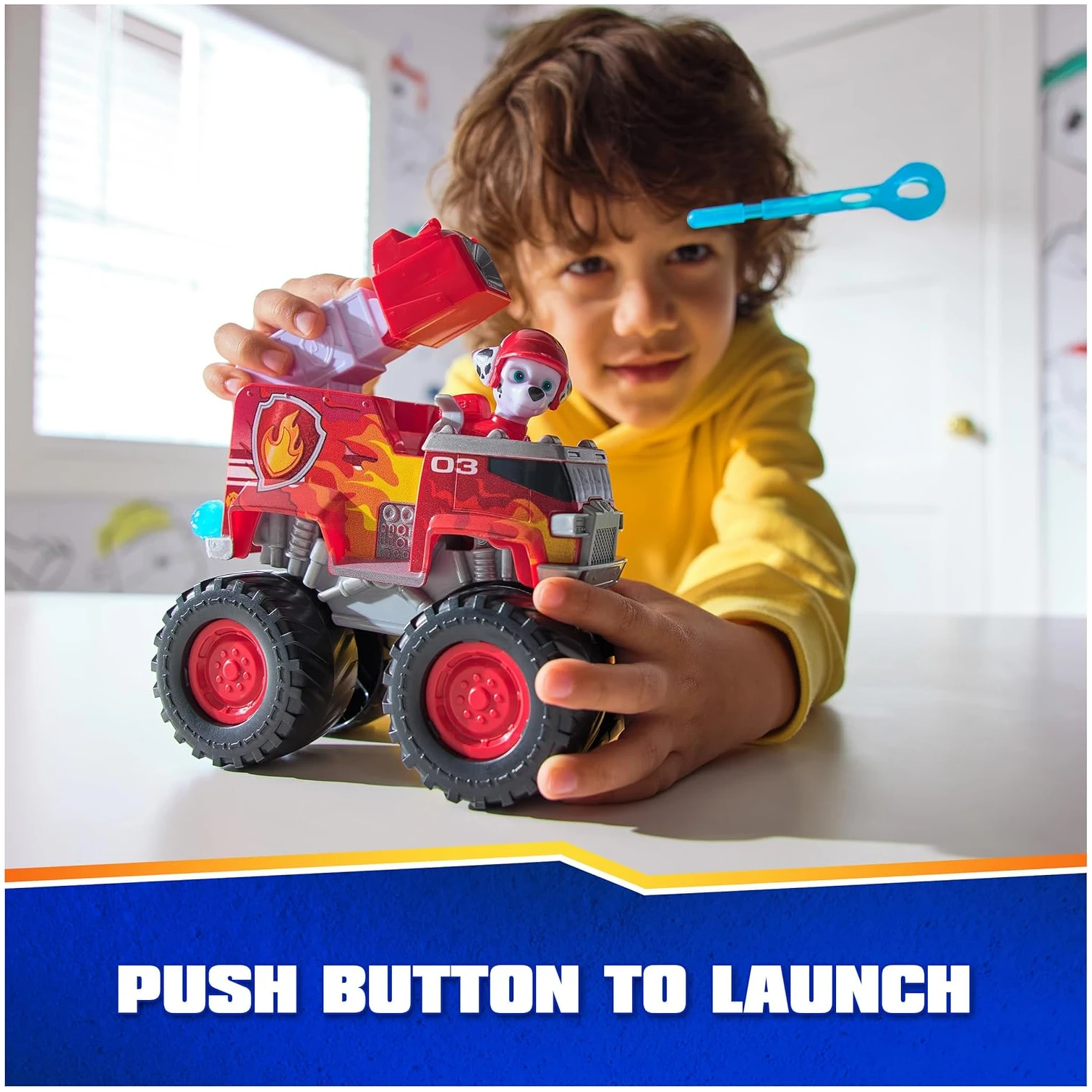 Ce jouet comprend une figurine amovible de Marcus avec son uniforme de mission tout-terrain, ainsi qu’un camion de pompiers équipé d’un lance-projectiles et de deux projectiles.
